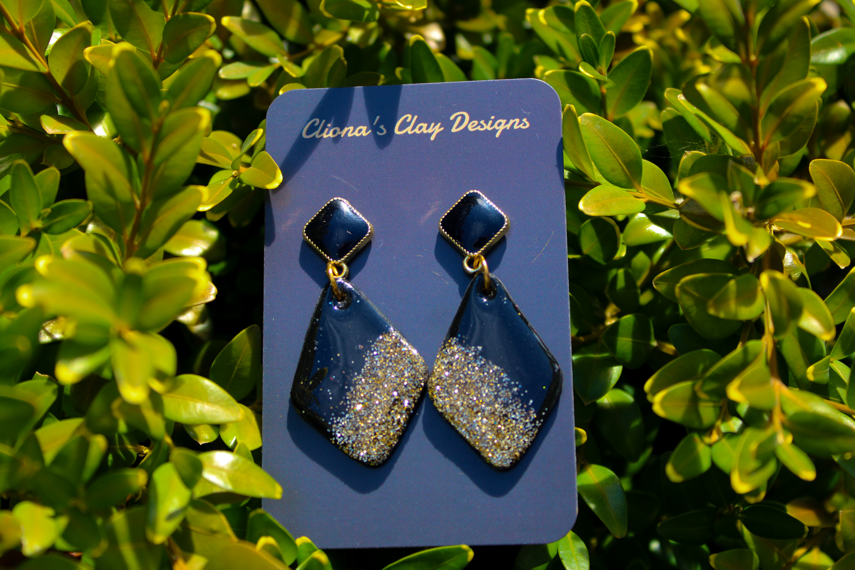 Home / SHOP / Crafts / Cliona Clay Designs / Black Gold Glitter on Large Diamond on Black StudGorgeous, Unique and made with Love!