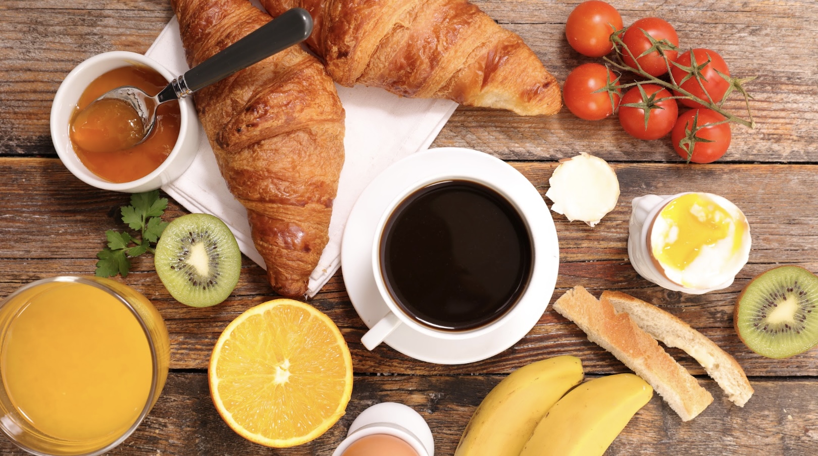 Orange Juice, Fresh Fruit Pots/Yoghurt Muesli Pots, Scones/Croissants Tea and Coffee.
