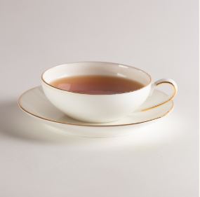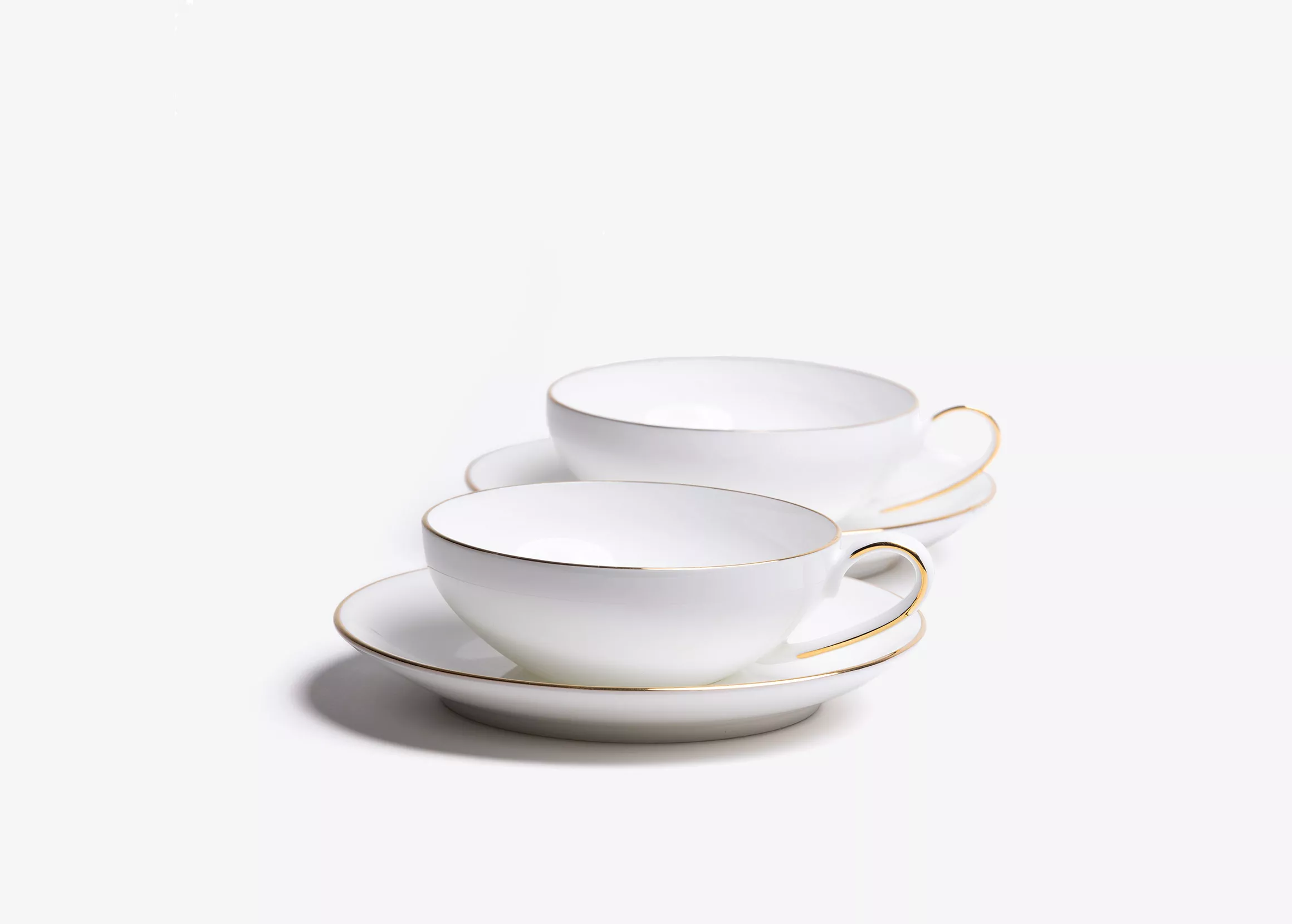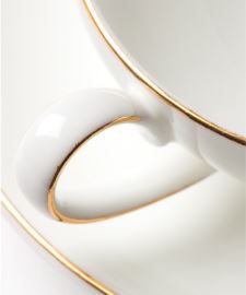A beautiful shape of cup with its wrapping saucer made of bone china. A simple golden thread set on a fine china gives this pair a modern and classic appeal, easy to combine with all styles. Capacity 12.5 cl - sold as a set of two cups. In the same collection, a teapot is available in 0.40 L or 1 L. To extend the life of this item and preserve the gilding, we recommend hand-washing it and not using it the in microwave.