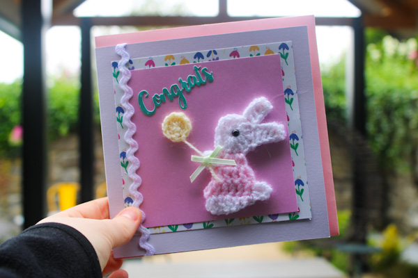 Home / SHOP / Crafts / Nell's Knits / Nell Knit's Cards / Congrats Bunny in Pink and PurpleHandcrafted Knitted Greeting Cards