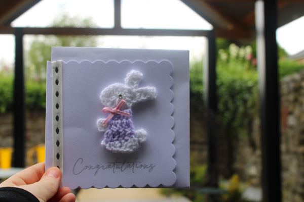 Home / SHOP / Crafts / Nell's Knits / Nell Knit's Cards / Congratulations Bunny in White and PurpleHandcrafted Knitted Greeting Cards