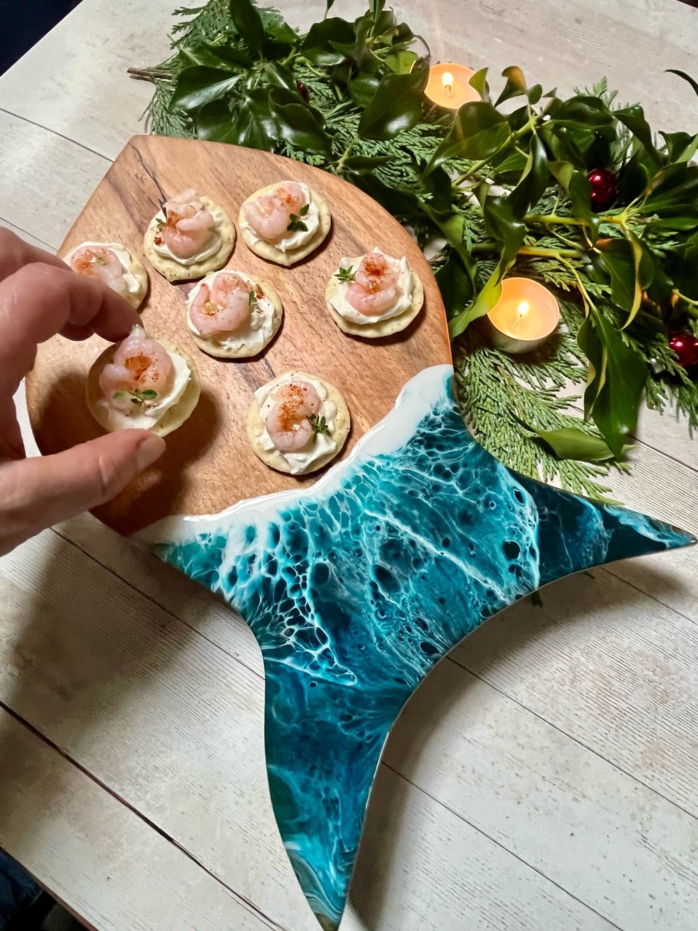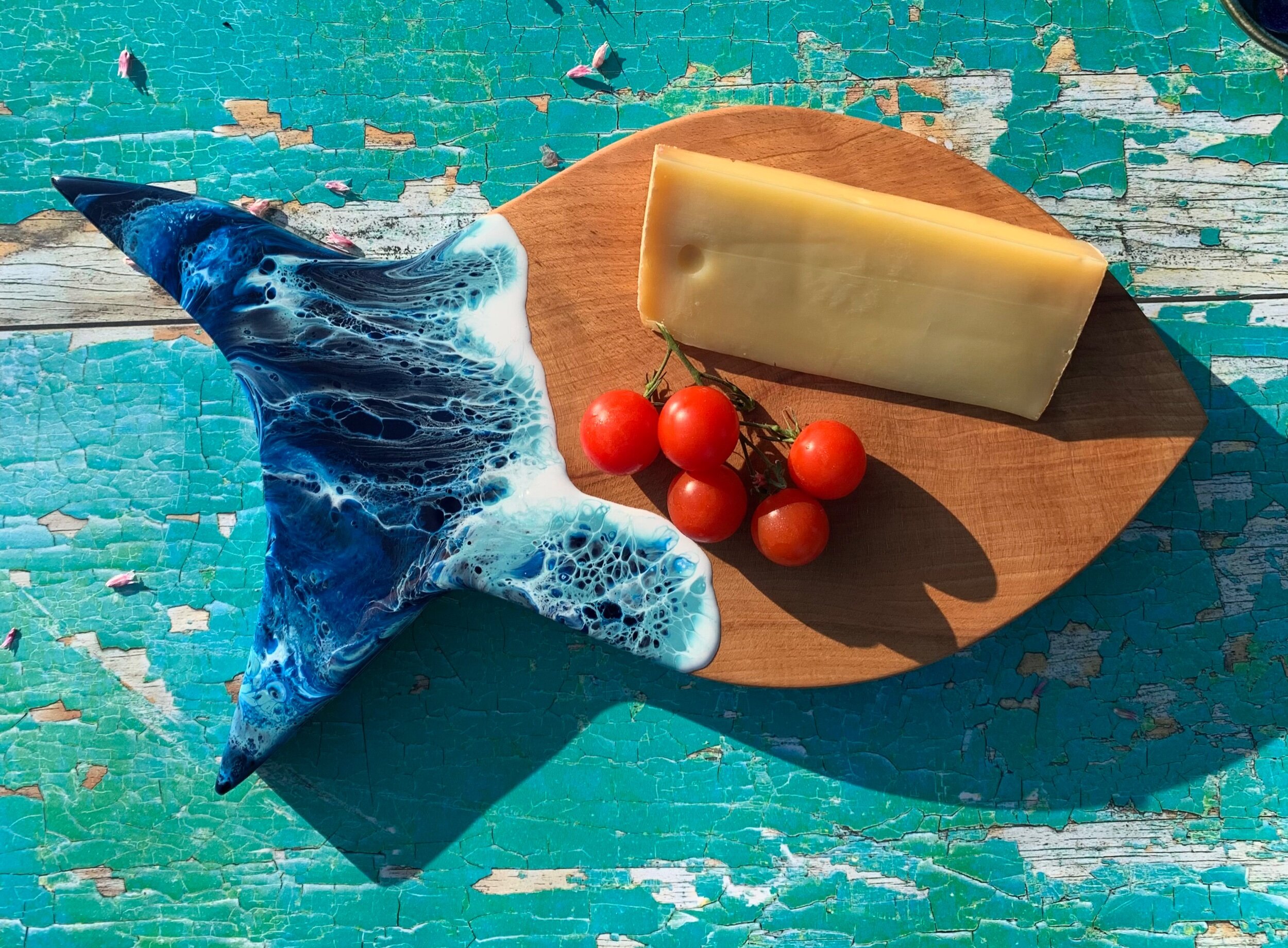 The wood used is sustainably sourced locally from trees that have come to the end of there natural lives, storm damaged or felled for being dangerous. The wood is kiln dried for 6-8 weeks to ensure that they will not warp or twist. Once the boards are cut out they are sanded, sanded and sanded some more. This creates a smooth base for the resin art. As resin art is a flow art it goes on liquid before being left to cure for 48 hours. Then it’s back to sanding the backs to remove resin residue and all the boards are finished with a food safe mineral oil to bring up the beauty of the wood grain.
