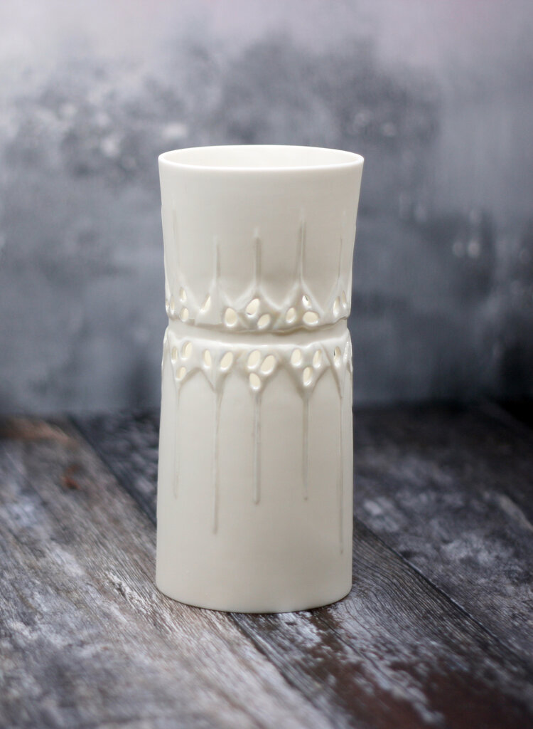 Handmade porcelain Forest vase by Wendy Ward.Satin porcelain matt finish with pearl glaze decoration. The Forest vase is ideal for adding a touch of character to your living space or as a unique decorative piece for the home. Each piece of the Forest collection is finely crafted using a slip casting technique, and are hand carved and finished before firing.