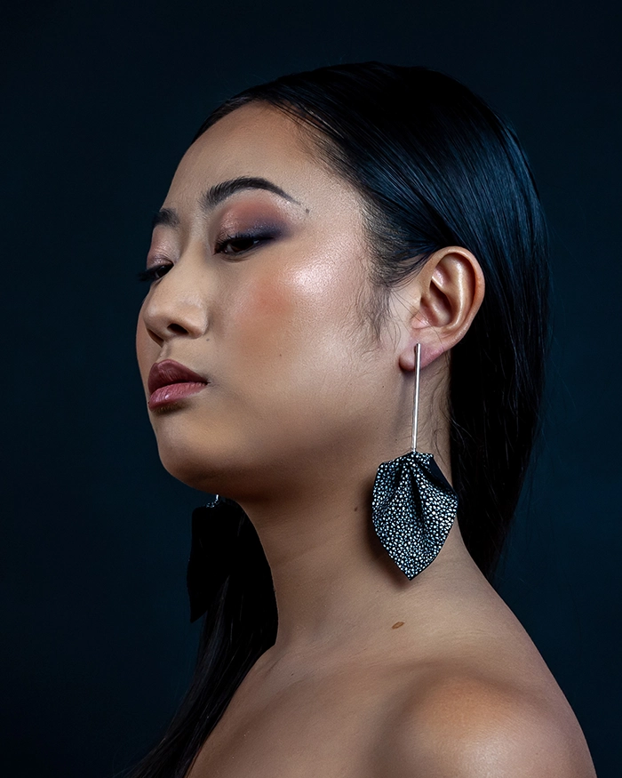 Discover the O'FEYAA earrings, a statement of glamour in stained black leather evoking the grace of a leaf.