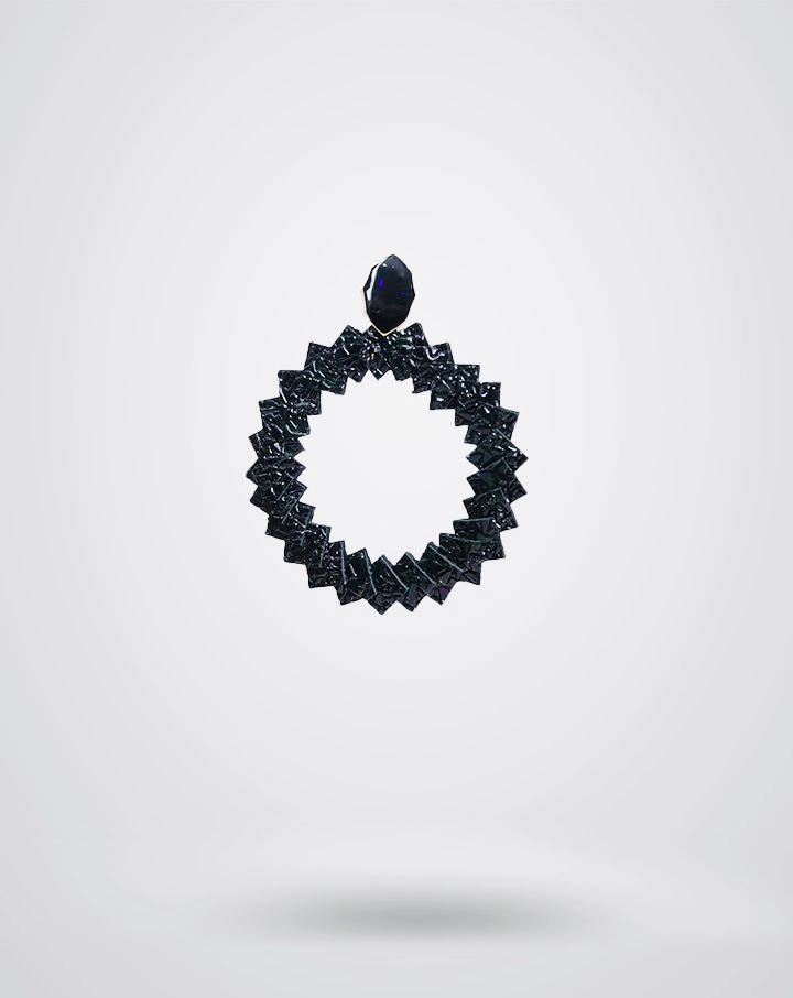 Discover the O'MELO earrings, a glamorous and modern piece of jewelry inspired by geometric shapes. Crafted from black leather with shards of glass, they subtly catch the light for a shimmering effect.