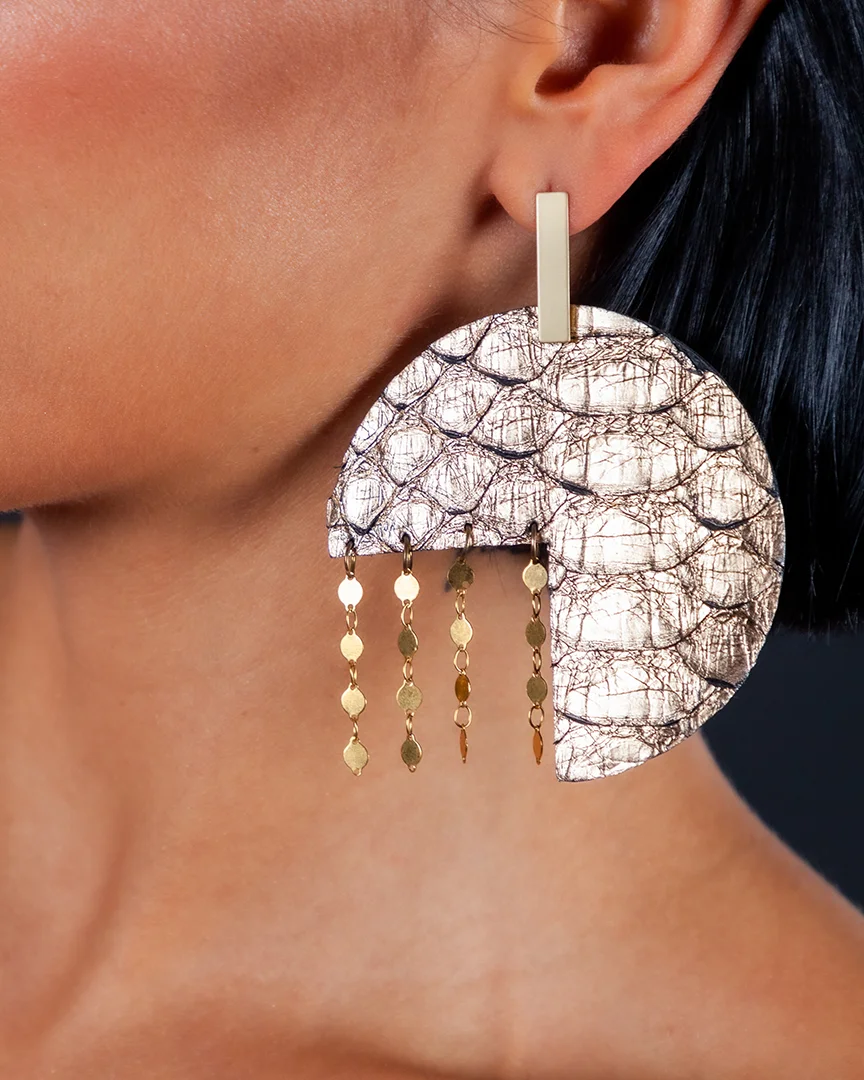 Discover the O'PAK model, a dazzling piece in metallic champagne python leather that combines boldness and sophistication. Its contemporary design, embellished with glittering chains, creates a captivating play of light that is a real eye-catcher. Known for its robustness, this noble leather offers unparalleled opulence, making this piece of jewelry a perfect choice for any occasion.