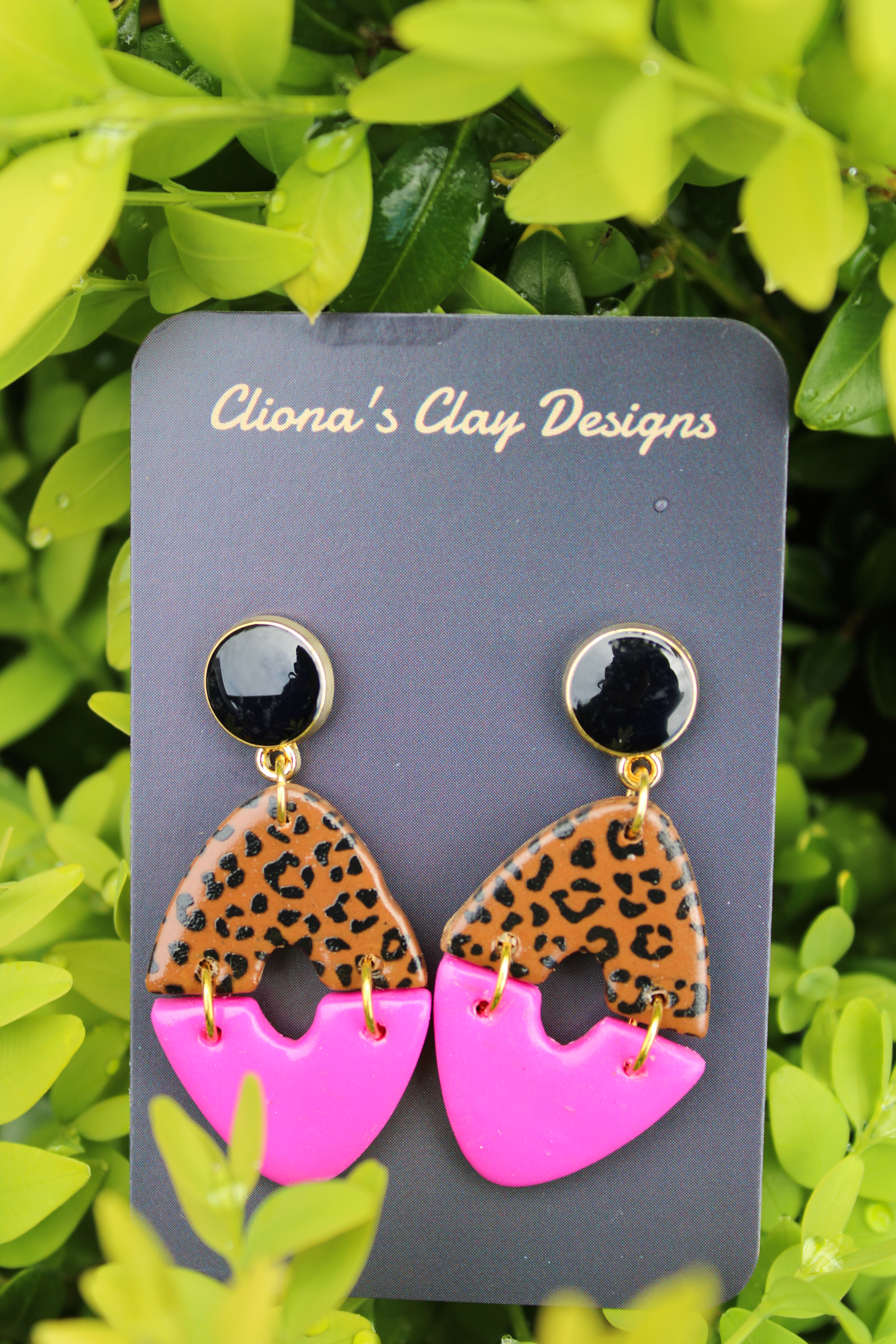 Home / SHOP / Crafts / Cliona Clay Designs / Pink and Leopard ½ and ½ on Black StudGorgeous, Unique and made with Love!