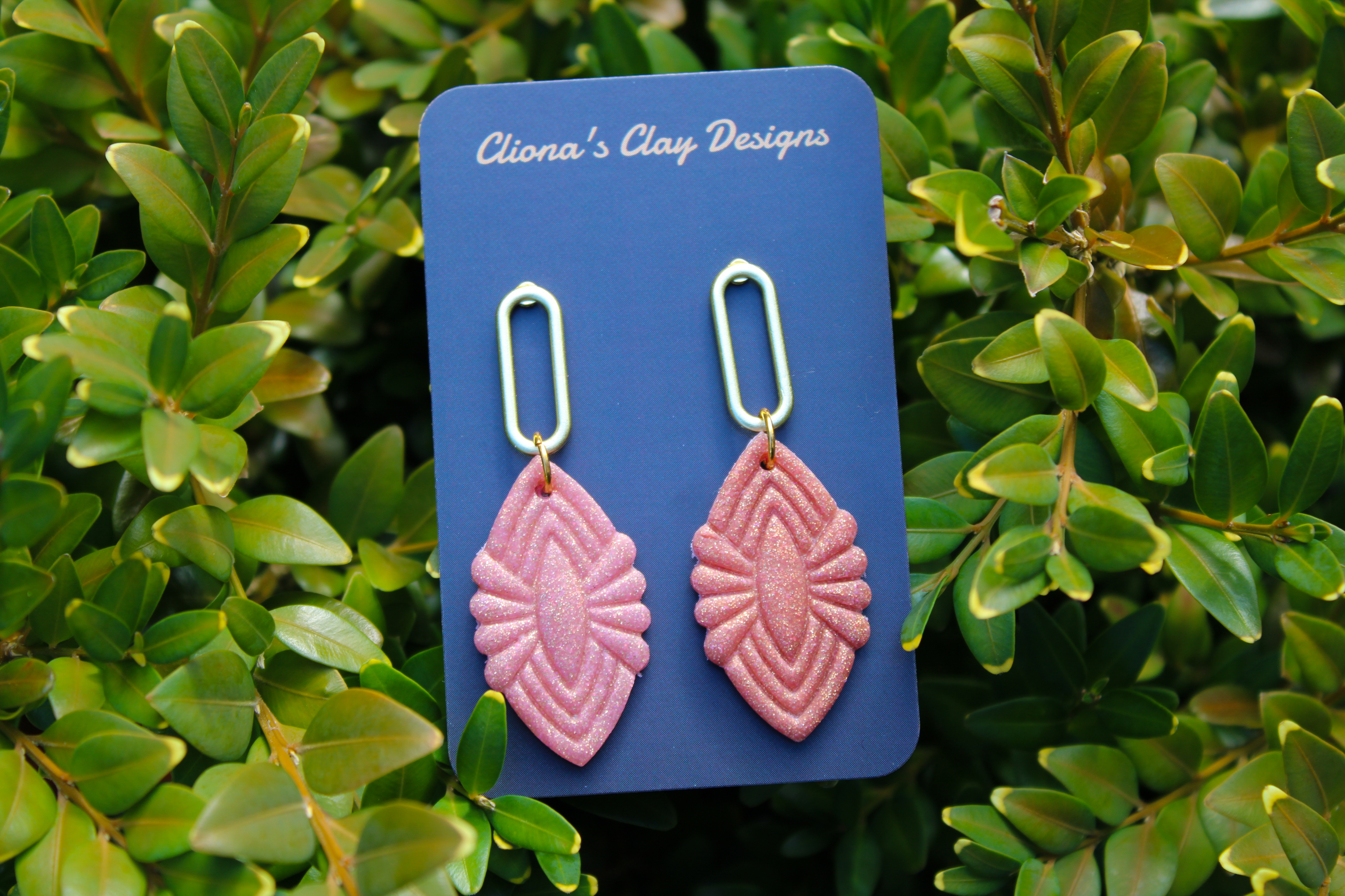 Home / SHOP / Crafts / Cliona Clay Designs / Pink Glitter Drop on Oval Long Oval Gold StudGorgeous, Unique and made with Love!
