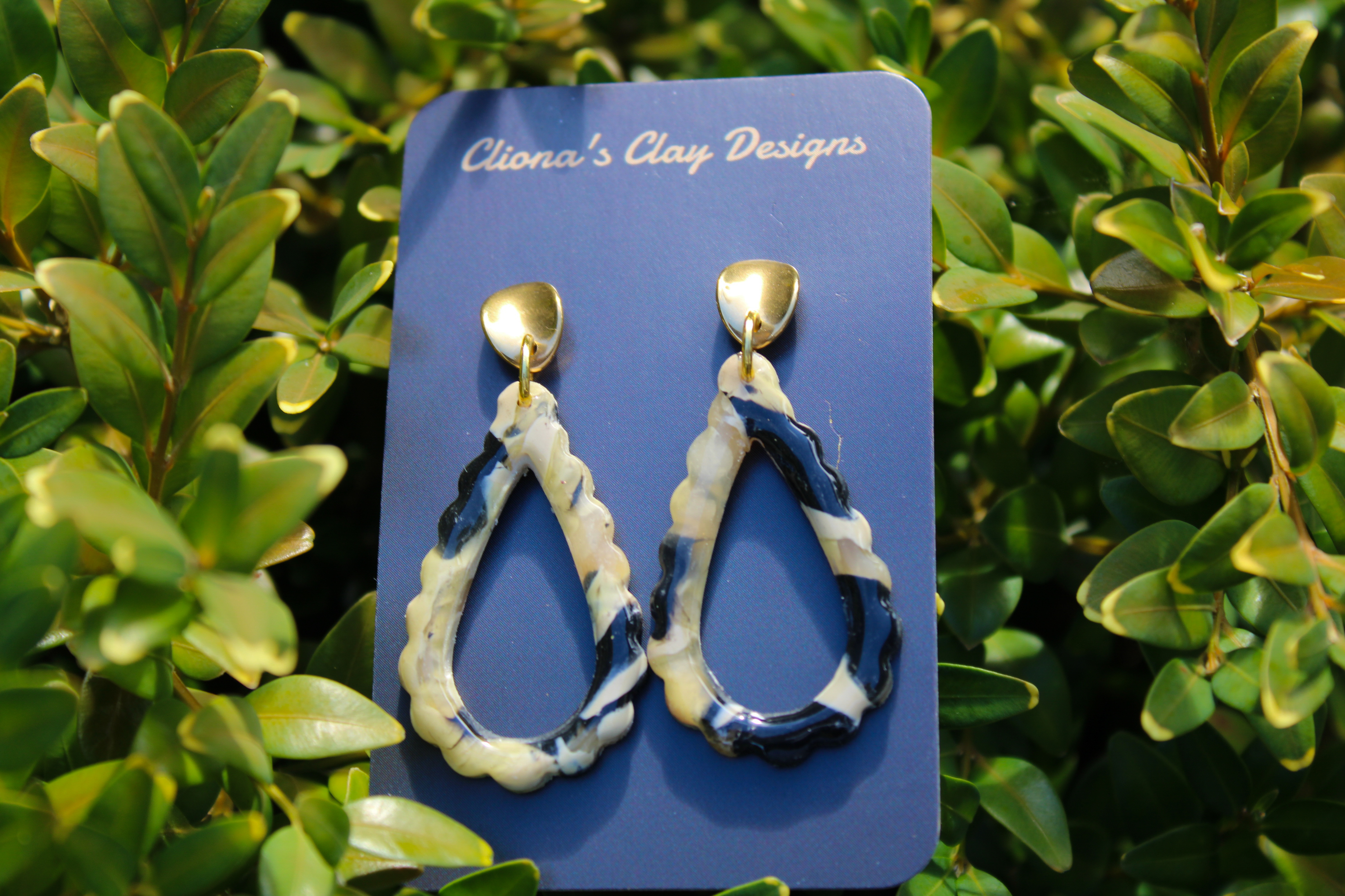 Home / SHOP / Crafts / Cliona Clay Designs / Tortishell Black and Cream Hollow Drop, on Gold StudGorgeous, Unique and made with Love!