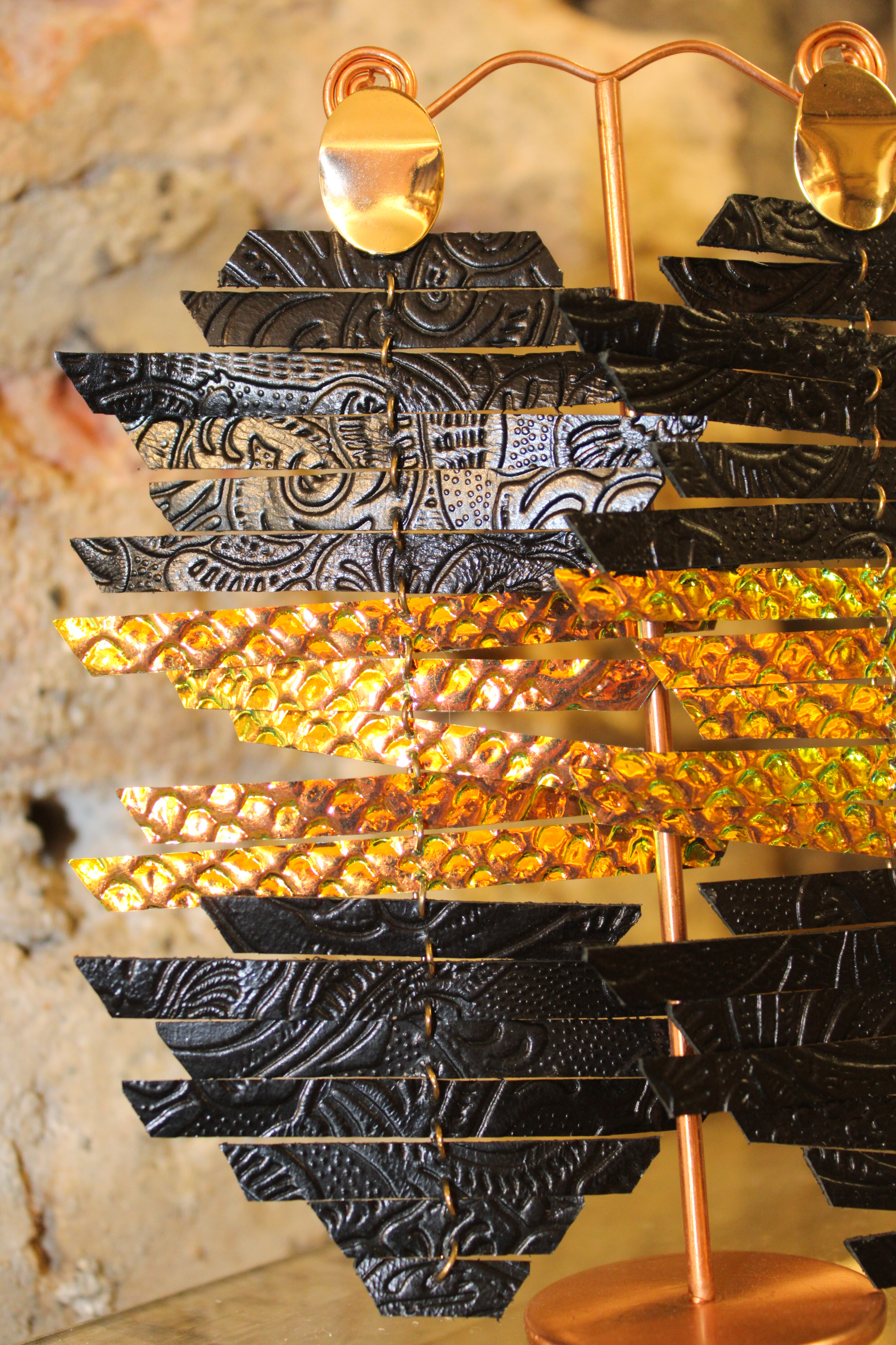 A majestic, bold and refined piece of jewelry, crafted in black leather with bursts of green and holographic gold leather.