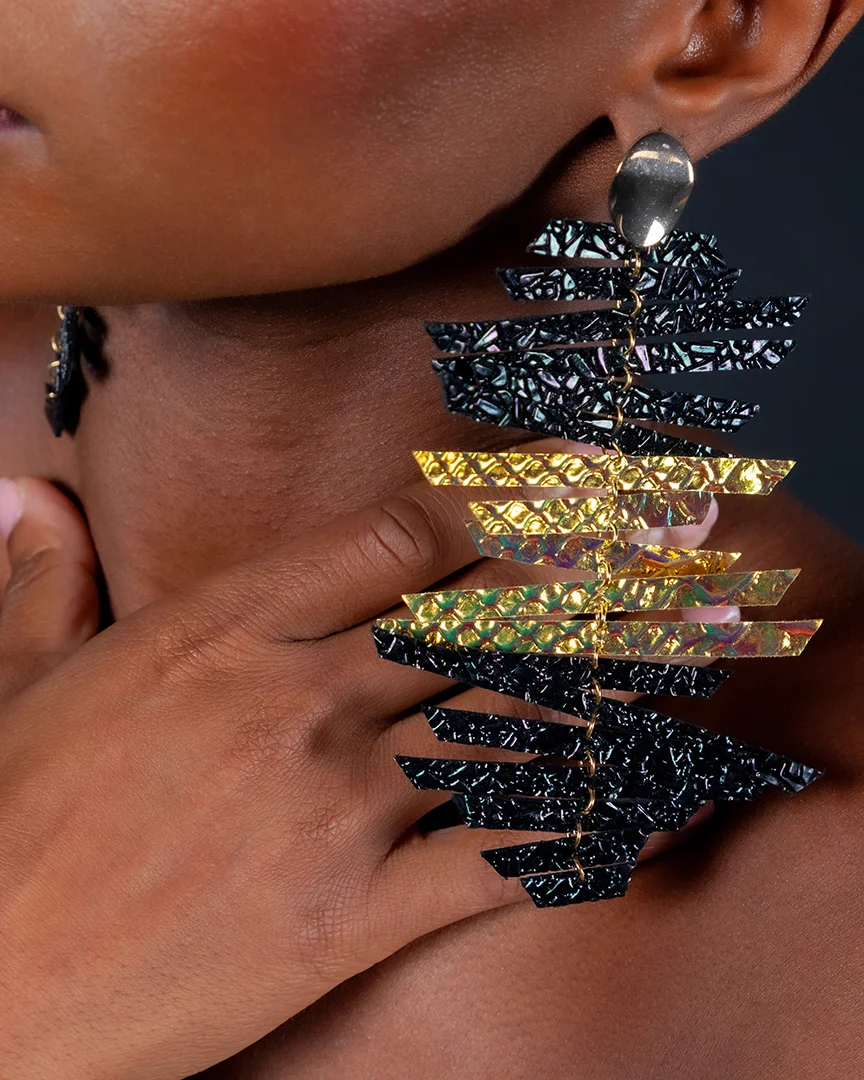 ZA'O XL is a majestic, bold and refined piece of jewelry, crafted in black leather with bursts of green and holographic gold leather. These XL earrings combine geometric shapes and luminous textures for a captivating effect.