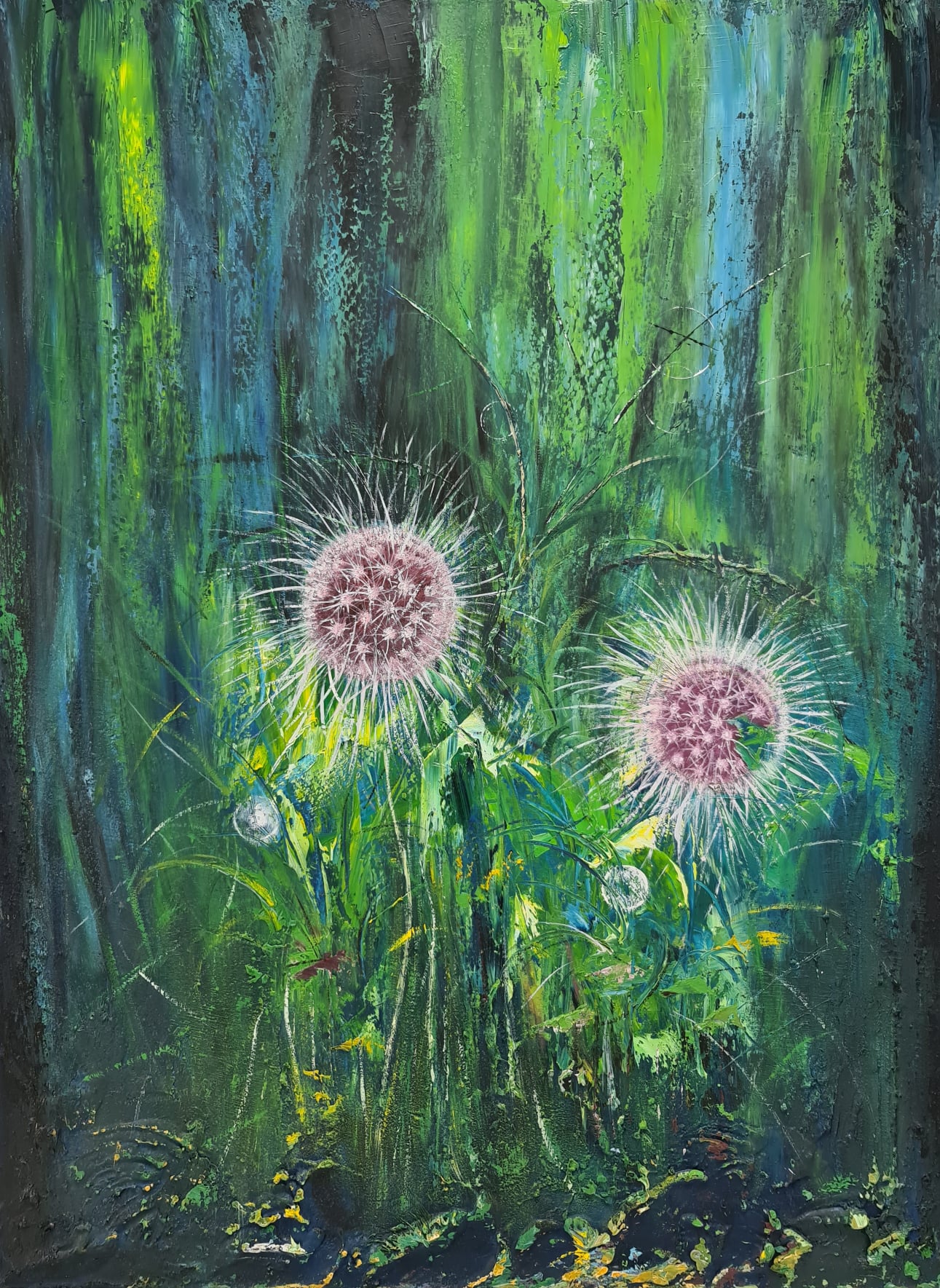 Blending influences from her spirituality with those from nature, with sensitivity and harmony, she paints works in which familiar places are turned into timeless landscapes and shrouded in a veil of mystery. Her paintings tell the story of her own emotions, her memories and her dreams, creating the enchanted atmosphere, which surrounds her work and distinguishes them. Her work is abstract in nature and is inspired by our natural surroundings and spiritual influences. The pictures reveal her intense deep feeling of connection to the landscape of the Irish countryside, especially the West coast, but also to the spiritual and mystical dimension of Ireland where handed-down legends, stories and fairytales are still alive today.